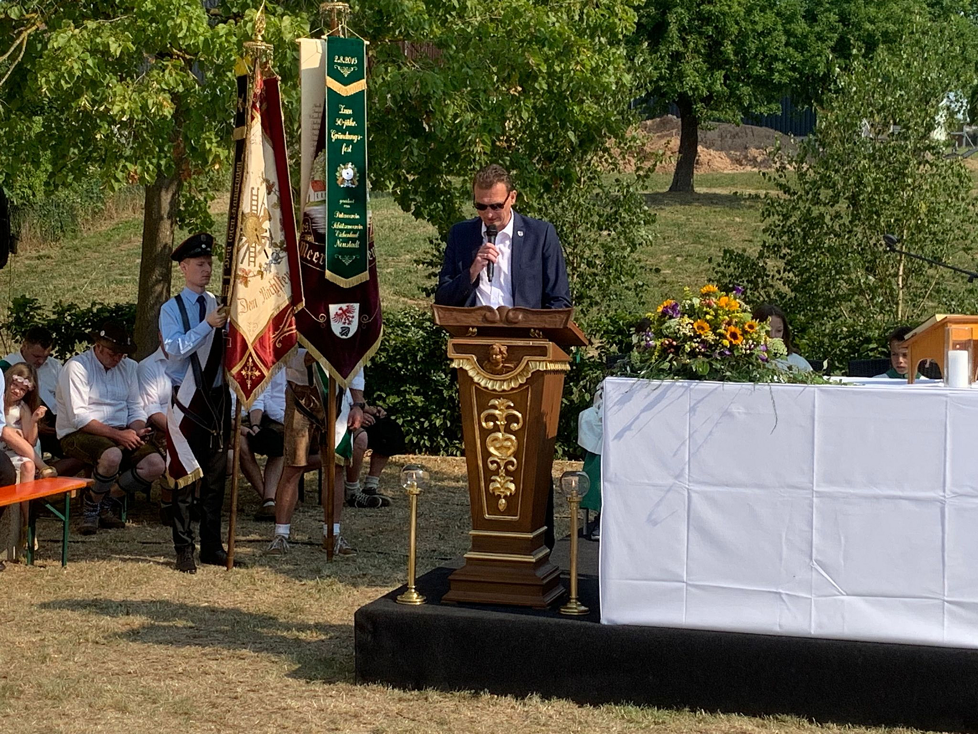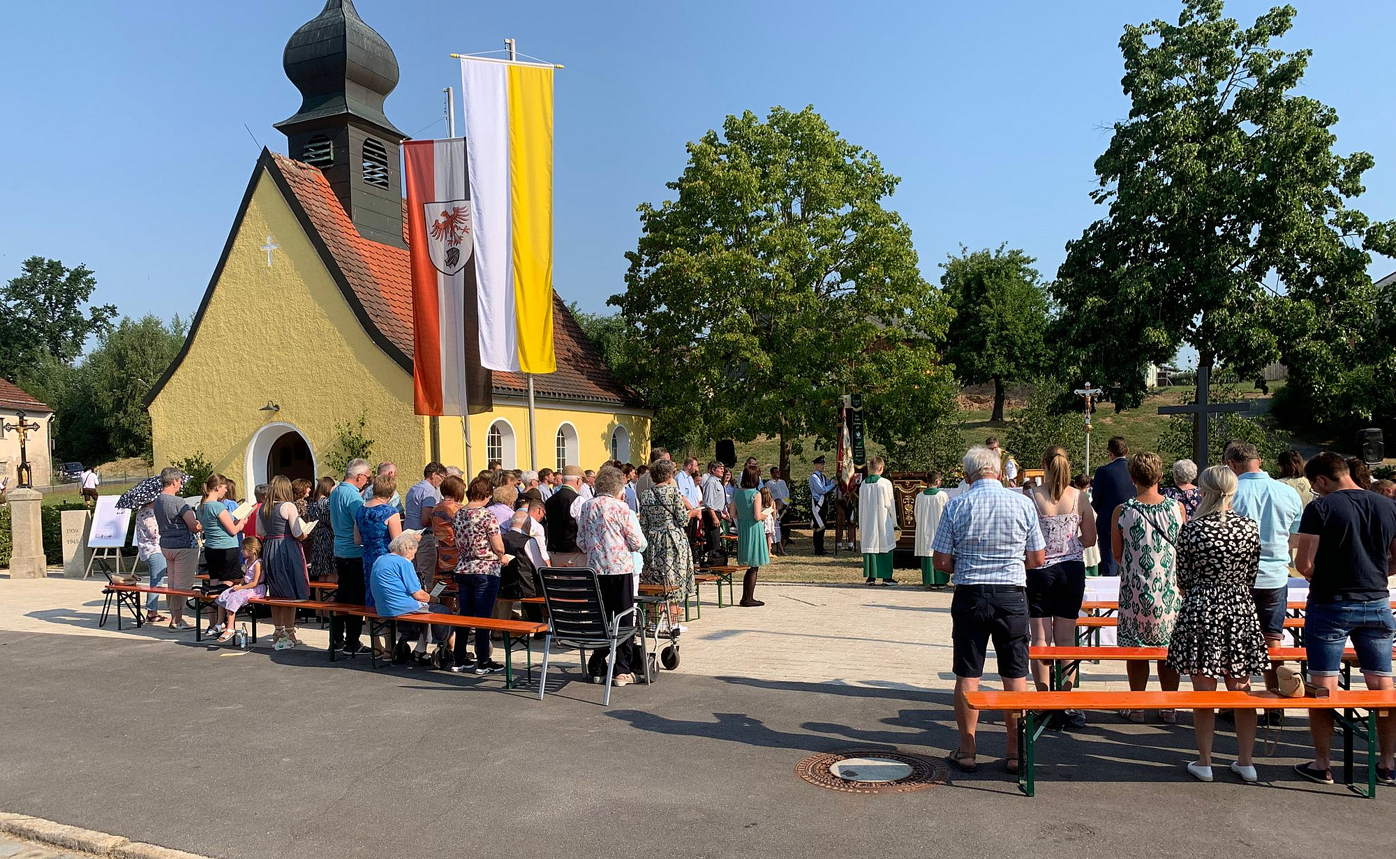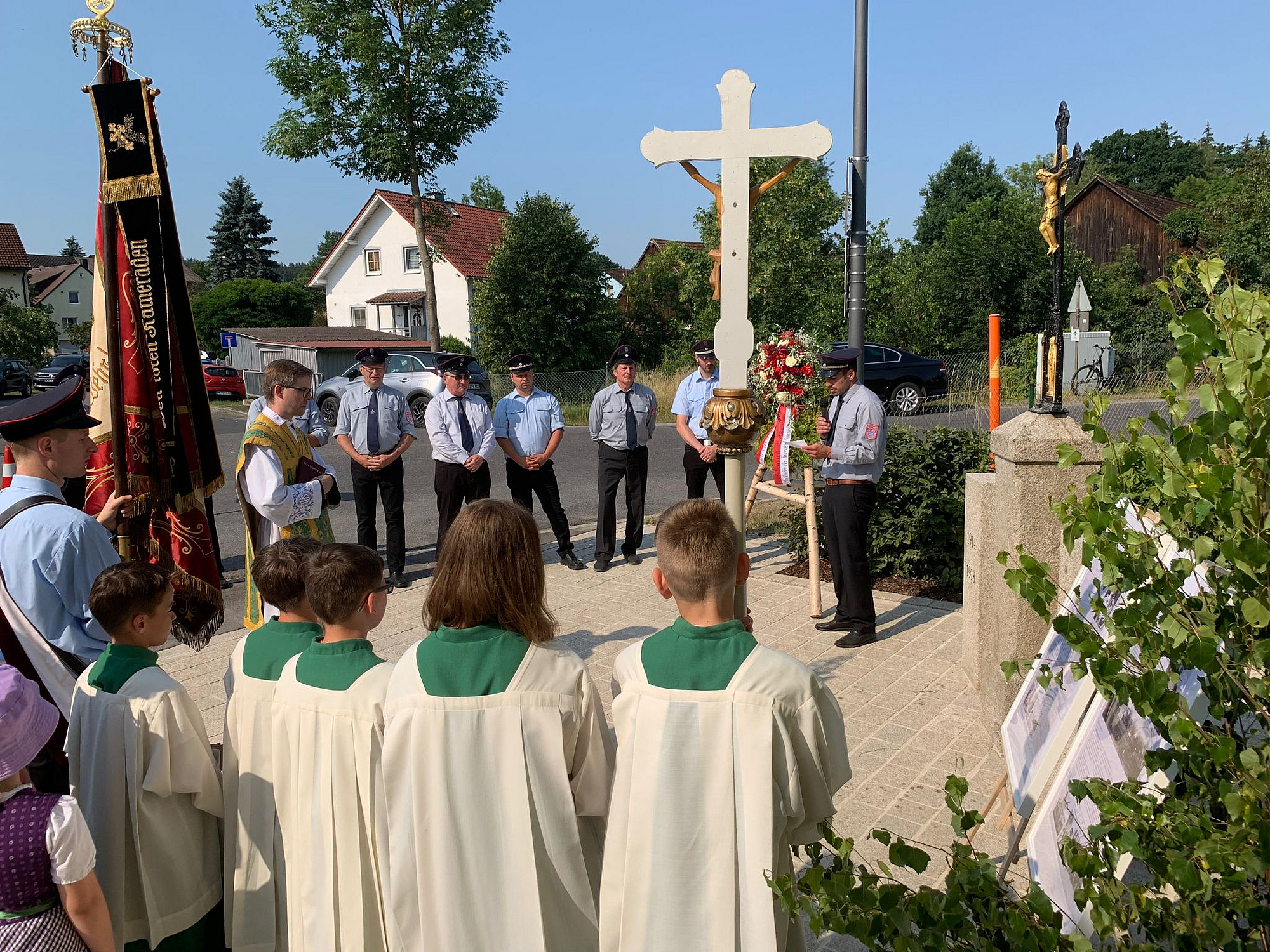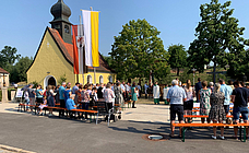 Bei sommerlichen Temperaturen weihte die Meerbodenreuther Dorfgemeinschaft den neuen Dorfplatz als neuen Mittelpunkt ein. Nach Kirchenzug und Gottesdienst, bei dem Pfarrer Thomas Kopp den Platz, das neue Kreuz und das neue Kriegerdenkmal segnete, dankte Bürgermeister Ernst Schicketanz allen Beteiligten, der Dorfgemeinschaft, den Vereinen, den Gemeinderäten und den Baufirmen für die Neugestaltung. Besonderer Dank galt Stefanie Reichl-Trinkner für die Planung und Gestaltung.