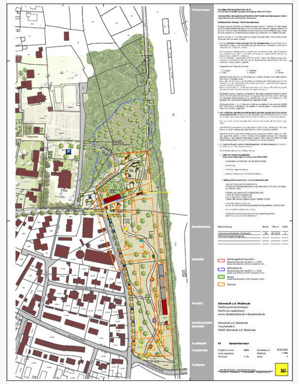 ->Wie aus nachstehenden Gesamtplan zu entnehmen ist, umfasst dieser die gesamte ehemalige Bleikristallfabrik Beyer und Co. Der derzeit mit Altlasten belastete Bereich wird nach der erfolgten Sanierung ein Herzstück der Gemeinde Altenstadt werden, in dem sich Nutzungen in einem historischen Gebäude zu einer multifunktionalen Gemeinschaft aus verschiedenen Nutzern gegenseitig ergänzen und bereichern. Der Baubestand wird auf modernsten Stand saniert. Die Freibereiche wandeln sich von einer Altlastenbrachen in Erholungs- und Aktivitätszonen die eine identitätsstiftende ortsprägende Funktion aufweisen.